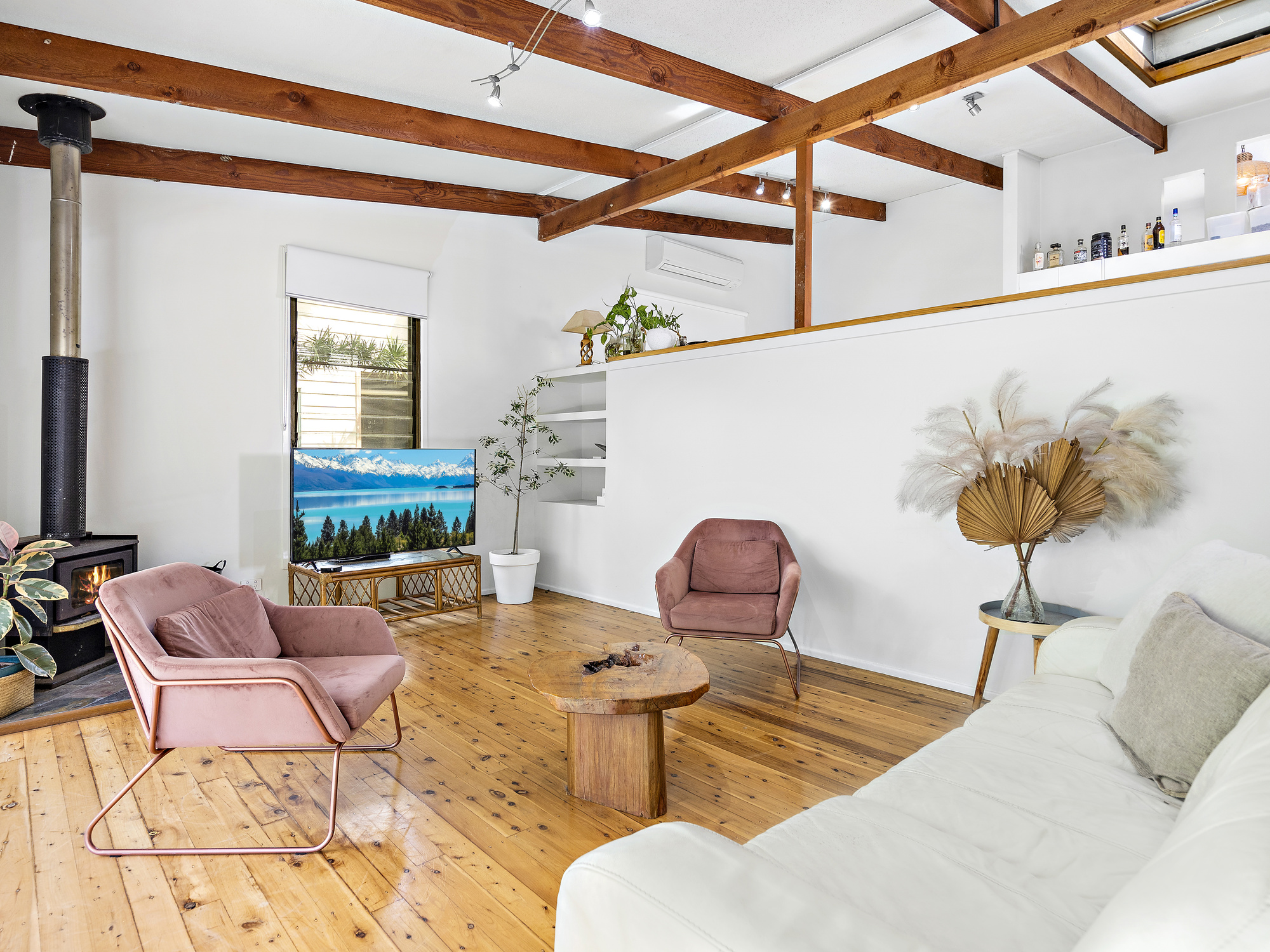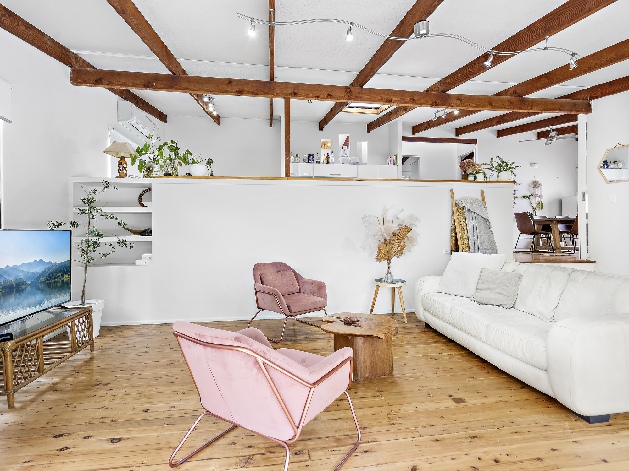 The entry level includes two bedrooms and a large modern bathroom. A few steps down takes you to the kitchen and dining room level. The modern styled kitchen is huge and has an abundance of natural light due to it be open plan that overlooks the main living level just below, large window and its striking sky-light . A separate dining room adjoins and again the timber floors and exposed timber beams are a real feature.